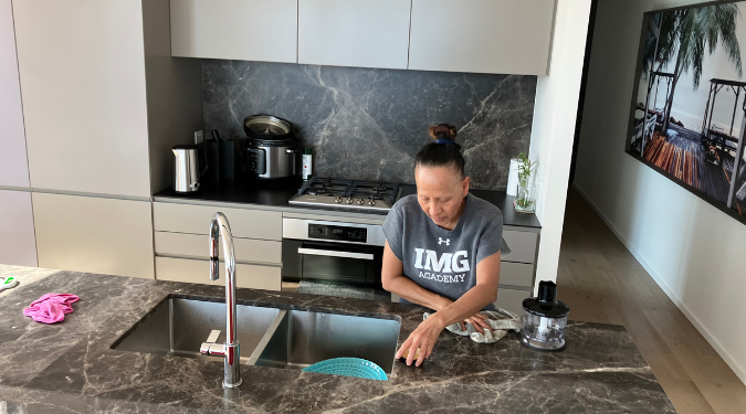 It usually includes detailed cleaning of benchtops, splashbacks, sinks, taps, cupboard fronts, cooktops, ovens, showers, vanities, toilets, mirrors, tiles, grout, floors and other high-impact surfaces buyers notice.